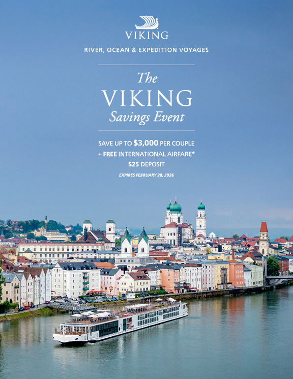 GENERAL RESTRICTIONS: Cruise fares listed are cruise only in CAD dollars, per person, based on double occupancy and for CA residents only. All fares and offers are for new bookings made February 1, 2026 to February 28, 2026, are subject to availability; may not be combinable with other offers except Viking Explorer Society Credit. Special cruise fares are based upon published full cruise fares; cruise fares do not include prepaid charges, optional facilities, and personal charges, as defined in the terms and conditions of the Passenger Ticket Contract which may be viewed elsewhere on this website. Full cruise fares may not have resulted in actual sales in all stateroom categories and may not have been in effect during the last 90 days. Promotional fares may remain in effect after the expiration date. Air promotion applies to economy, roundtrip flights only from select Viking River Cruises CA gateways and includes airport-to-ship or hotel transfers, air taxes and air fuel surcharges. Viking reserves the right to correct errors or omissions and to change any and all fares at any time. For up-to-date prices, please call Viking or your Travel Agent. Additional terms and conditions may apply. Complete terms and conditions may be found in the Passenger Ticket Contract.