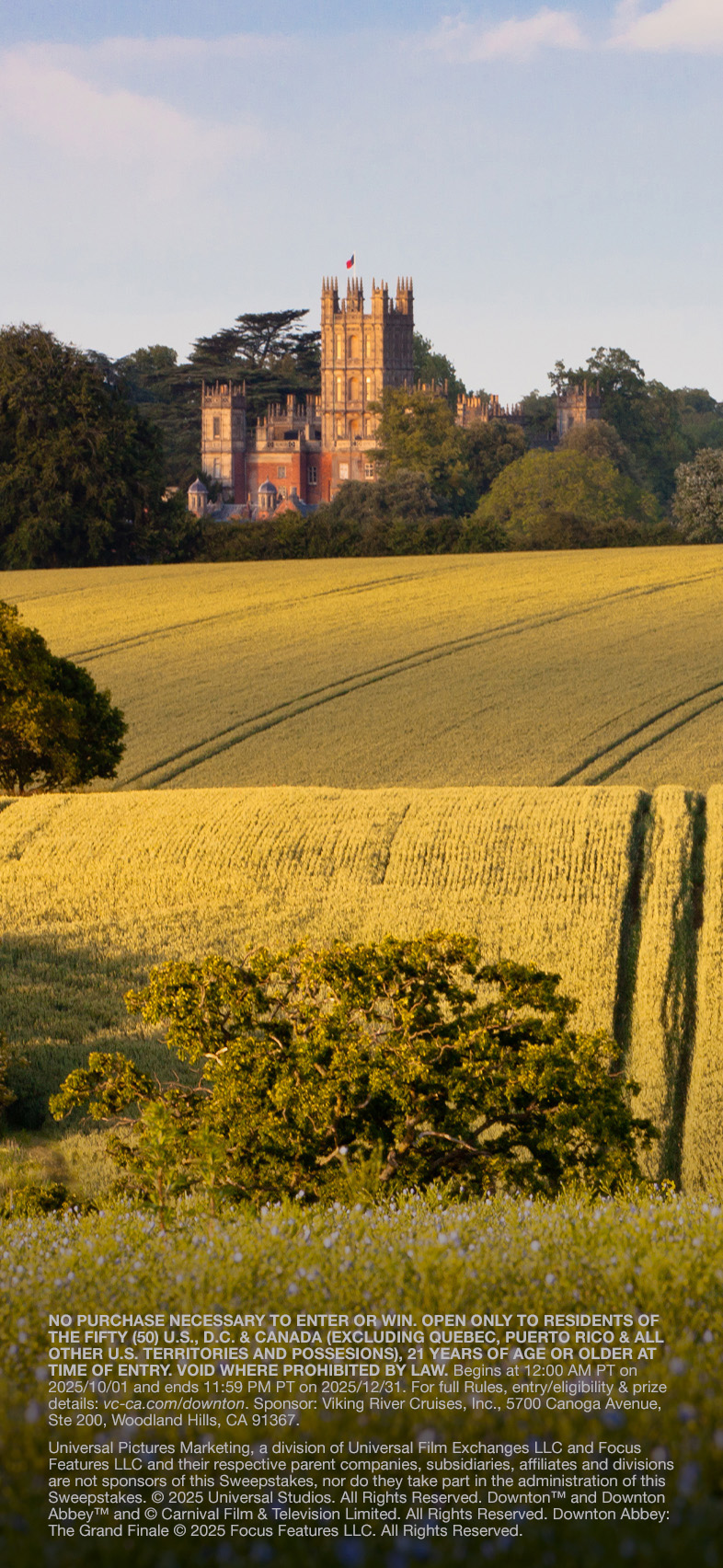 NO PURCHASE NECESSARY TO ENTER OR WIN. OPEN ONLY TO RESIDENTS OF THE FIFTY (50) U.S., D.C. & CANADA (EXCLUDING QUEBEC, PUERTO RICO & ALL OTHER U.S. TERRITORIES AND POSSESIONS), 21 YEARS OF AGE OR OLDER AT TIME OF ENTRY. VOID WHERE PROHIBITED BY LAW. Begins at 12:00 AM PT on 10/1/2025 and ends at 11:59 PM PT on 12/31/2025. For full Rules, entry/eligibility & prize details: viking.com/downton