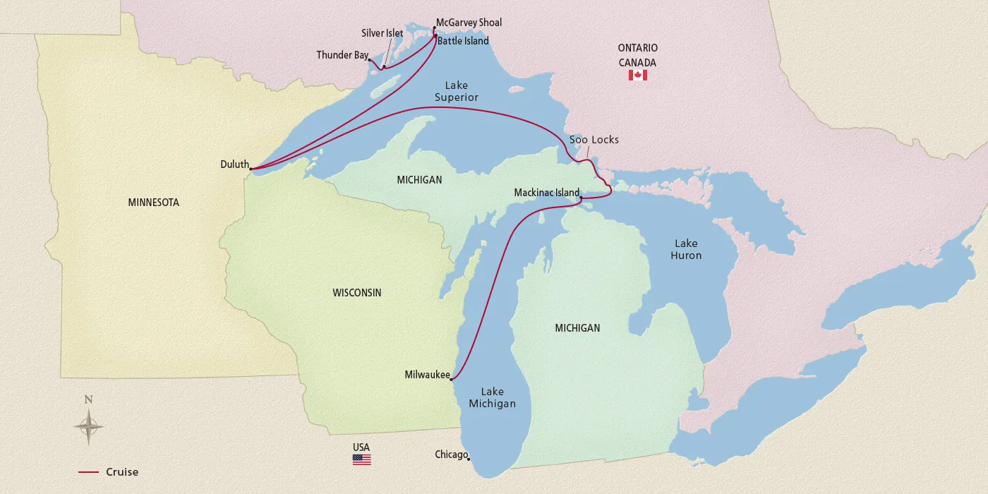 Cross the width of Lake Superior between Duluth and the Soo Locks, exploring the lake’s North Shore Inside Passage as you sail. Hike along clifftop trails for sweeping views of the lake. Gain insight into the unique features and ecosystems of remote wilderness islands, and admire Kakabeka Falls, the “Niagara of the North.” Follow in the footsteps of fur traders in Duluth and step back in time as you stroll the quaint, car-free streets of Mackinac Island.