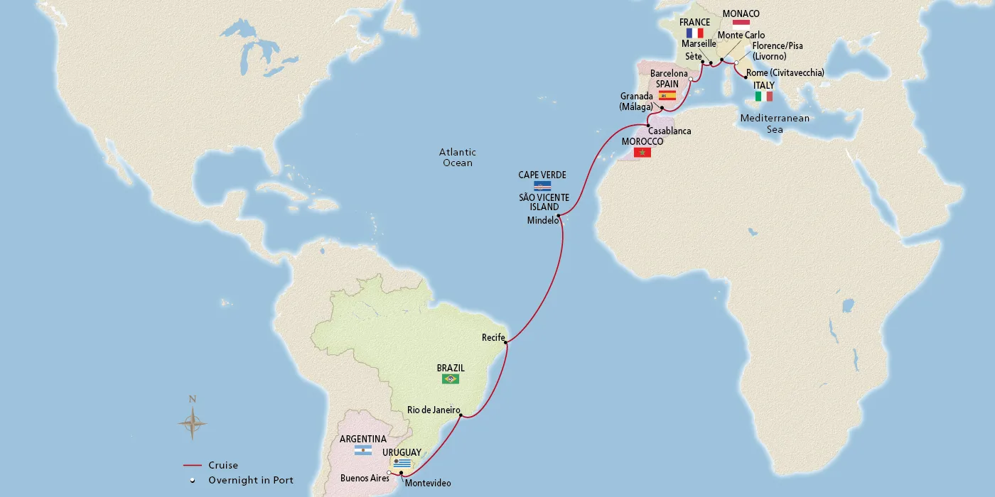 Explore the Renaissance masterpieces of Florence, witness multicultural Marseille and be captivated by the glamour of the French Riviera in Monte Carlo. Immerse yourself in the charms of Catalonian Barcelona and Andalusian Granada, then discover the historic Moroccan city of Casablanca. Sail across the Atlantic Ocean to experience the vibrant and eclectic cultures of South America in Rio de Janeiro, Montevideo and Buenos Aires.